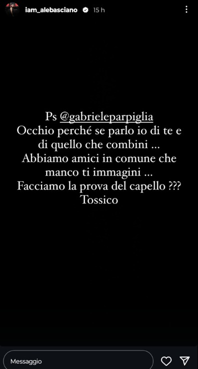 Infine, ha asserito: “P.S. Gabriele Parpiglia: occhio perché se parlo io di te e di quello che combini.. Abbiamo amici in comune che manco ti immagini… Facciamo la prova del capello? Tossico”.