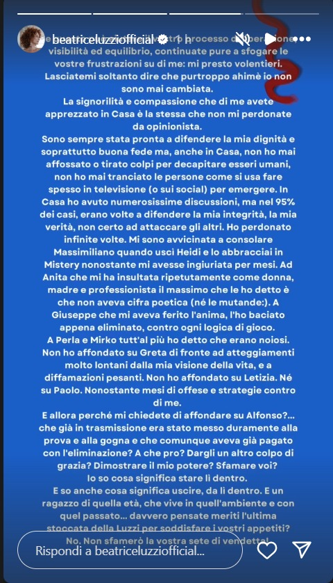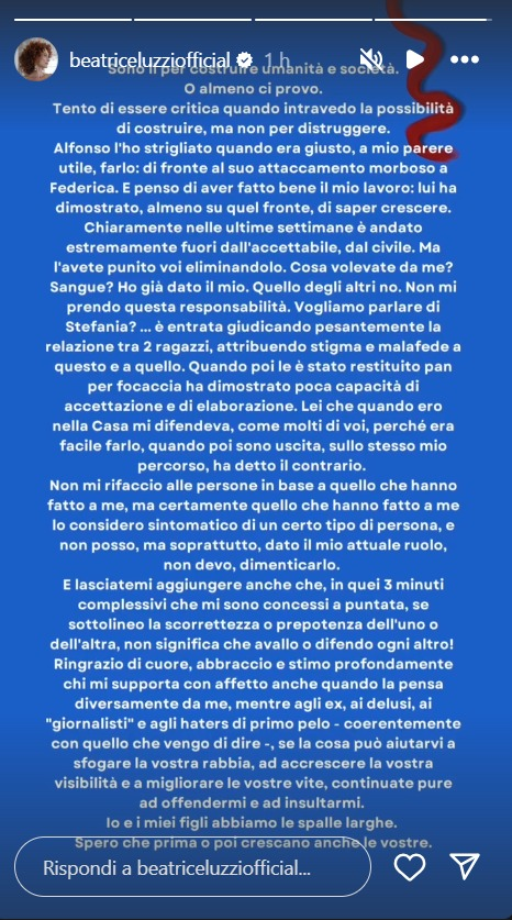 ANTICIPAZIONI GF 18, SPOILER 20 FEBBRAIO 2025: BEATRICE LUZZI RISPONDE ALLE POLEMICHE. LE DICHIARAZIONI DELL’OPINIONISTA DEL REALITY SHOW DI CANALE CINQUE CONDOTTO DA ALFONSO SIGNORINI- Beatrice Luzzi, opinionista del Grande Fratello, reality show di Canale Cinque condotto da Alfonso Signorini, ha replicato alle accuse degli haters e ha cercato di spegnere le polemiche. Scopriamo insieme il contenuto delle stories pubblicate poco fa sul profilo Instagram ufficiale dell’ex volto del programma televisivo di Mediaset.