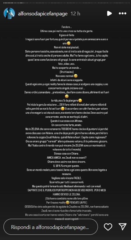 Infine, la fan page conclude dicendo: “Questo è successo con Alfonso, un concorrente forte, amato. Ma le Zelena sono veramente tossiche, hanno deciso di puntare lui perché aveva discusso con Helena, una che dopo pochi giorni hanno odiato perché loro volevano la coppia Zeudi Helena .. quindi Helena fuori. Capite come ragionano? Ora, se erano gruppi ‘normali’ potevamo giocarcela, potevamo votare. Ma l’Italia contro il mondo non può vincere. Stessa cosa con Chiara. Amica amica ma Zeudi non va avanti? Chiara deve uscire e non deve vincere. Il 18% era per queste. Sono un mondo malato, sono tossici, fanno ogni anno questo. Non sono legate a nessuna. Vogliono solo vincere facile. Scorretto per tutti i concorrenti. Ma questo potrà fermarlo solo Mediaset eliminando i voti con email. Non hanno votato Chiara Cainelli perché le Zeudiners non volevano la sua vittoria”. Che cosa ne pensate?