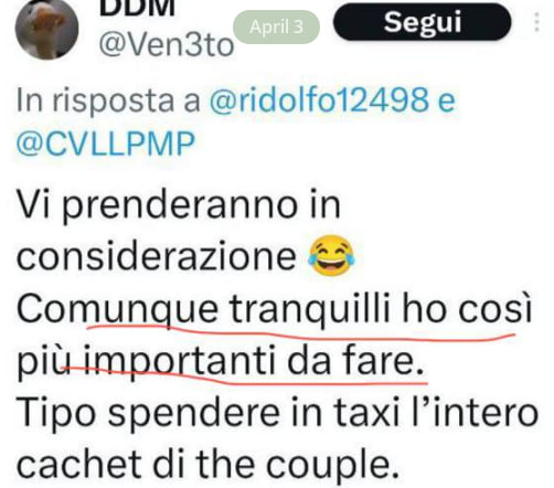 Ecco le parole di Daniele: “Vi prenderanno in considerazione. Comunque tranquilli, ho cose più importanti da fare. Tipo spendere in taxi l’intero cachet di The Couple”.