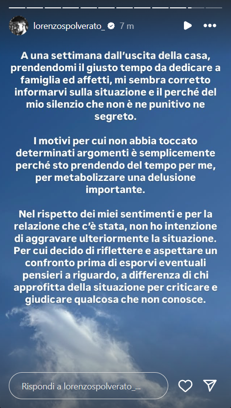 Ecco le parole di Spolverato: “A una settimana a dall’uscita dalla Casa del Grande Fratello, prendendomi il giusto tempo da dedicare a famiglia e affetti, mi sembra corretto informarvi sulla situazione e il perché del mio silenzio che non è né punitivo né segreto. I motivi per cui non abbia toccato determinati argomenti è semplicemente perché sto prendendo del tempo per me, per metabolizzare una delusione importante. Nel rispetto dei miei sentimenti e per la relazione che c’è stata, non ho intenzione di aggravare ulteriormente la situazione. Per cui decido di riflettere e aspettare un confronto prima di esporvi eventuali pensieri a riguardo, a differenza di chi approfitta della situazione per criticare e giudicare qualcosa che non conosce”.
