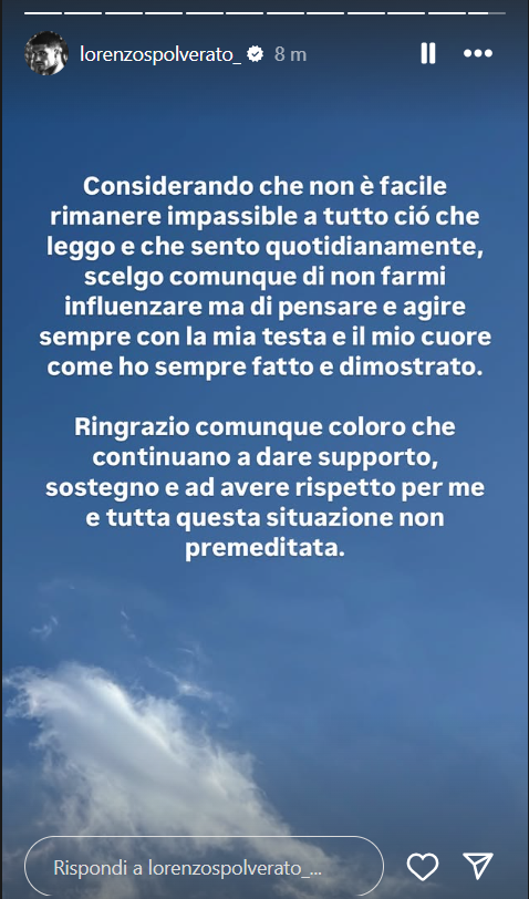 Infine, Lorenzo Spolverato, ha proseguito dicendo: “Considerando che non è facile rimanere impassibile a tutto ciò che leggo e che sento quotidianamente, scelgo comunque di non farmi influenzare ma di pensare e agire sempre con la mia testa e il mio cuore, come ho sempre fatto e dimostrato. Ringrazio comunque coloro che continuano a dare supporto, sostegno e ad aver rispetto per me e per tutta questa situazione non premeditata”.