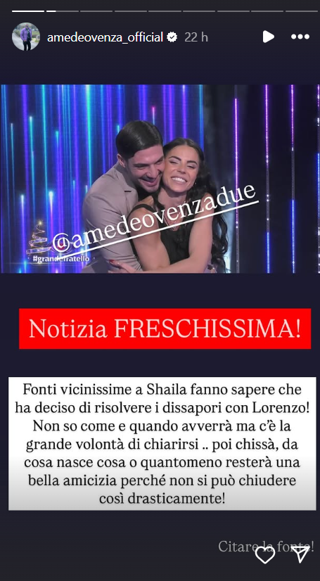 Ecco riportate, di seguito, le parole di Venza sui due concorrenti del Grande Fratello: “Fonti vicinissime a Shaila fanno sapere che ha deciso di risolvere i dissapori con Lorenzo! Non so come e quando avverrà ma c’è la grande volontà di chiarirsi.. poi chissà, da cosa nasce cosa o comunque resterà una bella amicizia perché non si può chiudere così drasticamente!”.
