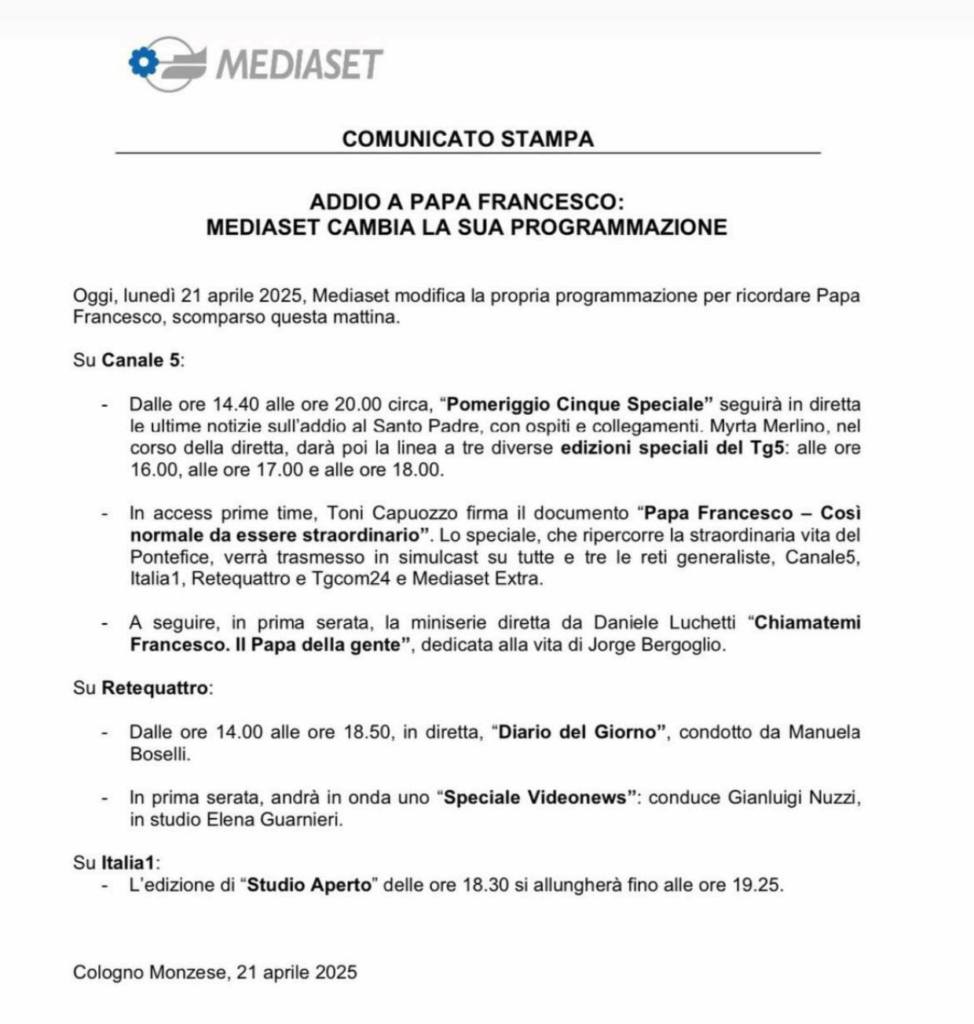 Ecco il comunicato ufficiale di Mediaset diramato poco fa: