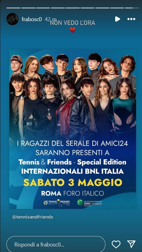 Ecco l’annuncio su Instagram: “I ragazzi del Serale di Amici 24 saranno presenti a Tennis & Friends- Special Edition Internazionali BNL Italia.. sabato 3 maggio, Foro Italico”.