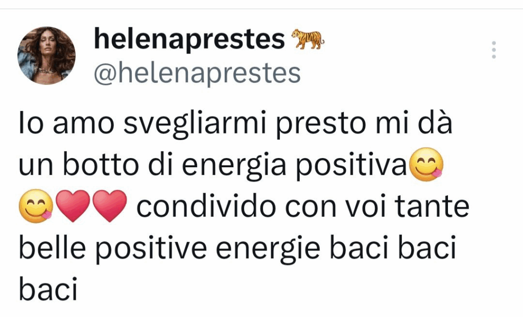Ecco le prime dichiarazioni di Helena su X: “Io Amo svegliarmi preso.. mi dà un botto di energia positiva, condivido con voi tante belle positive energie.. Baci baci baci“.