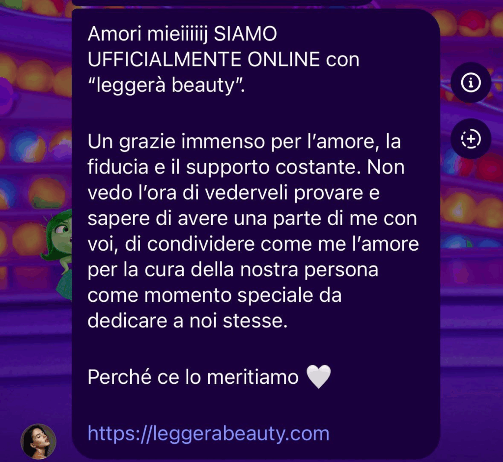 Ecco le dichiarazioni di Shaila Gatta: “Amori miei siamo ufficialmente online con “leggera beauty”. Un grazie immenso per l’amore, la fiducia e il supporto costante. Non vedo l’ora di vederveli provare e sapere di avere una parte di me con voi, di condividere come me l’amore per la cura della nostra persona come momento speciale da dedicare a noi stesse. Perché ce lo meritiamo”.