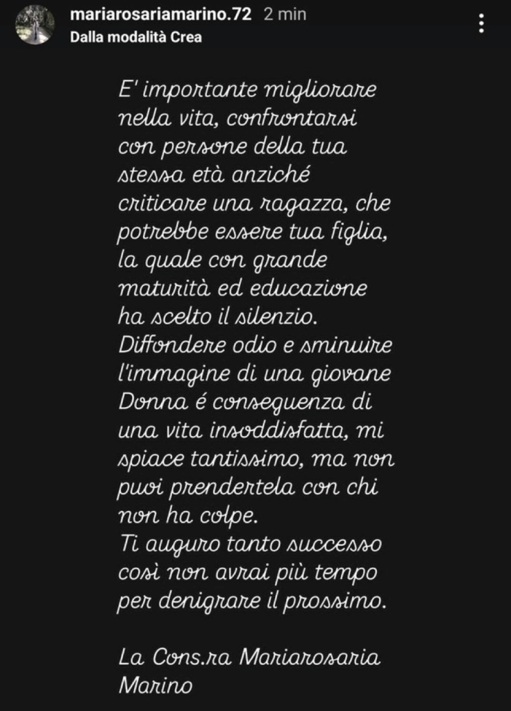 Ecco riportate, di seguito, le dichiarazioni della mamma di Zeudi: “Migliorare è importante nella vita, confrontarsi con persone della tua stessa età anziché criticare una ragazza, che potrebbe essere tua figlia, la quale con grande maturità ed educazione ha scelto il silenzio. Diffondere odio e sminuire l’immagine di una giovane Donna è conseguenza di una vita insoddisfatta, mi spiace tantissimo, ma non puoi prendertela con chi non ha colpe. Ti auguro tanto successo così non avrai più tempo per denigrare il prossimo. La Consigliera, Maria Rosaria Marino”.