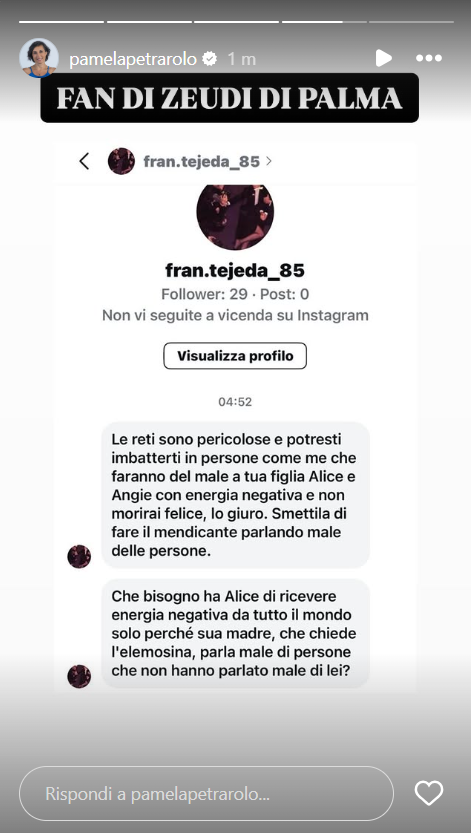 ULTIM’ORA GF, PAMELA PETRAROLO CONTRO IL FANDOM DI ZEUDI DI PALMA: LE PAROLE DELL’EX CONCORRENTE DEL REALITY DI MEDIASET CONDOTTO DA SIGNORINI (FOTO)- Siamo oramai giunti oltre ogni ragionevole limite: i fan di Zeudi Di Palma hanno minacciato la figlia di Pamela Petrarolo. L’ex concorrente del reality show di Canale 5 condotto da Alfonso Signorini, ha deciso infatti, di pubblicare tutto sul suo profilo Instagram ufficiale, denunciando l’increscioso episodio.