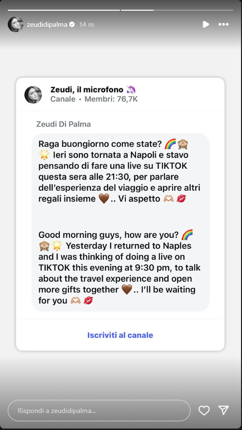 Ecco il comunicato ufficiale della Di Palma: “Raga buongiorno come state? Ieri sono tornata a Napoli e stavo pensando di fare una live su Tik Tok questa sera alle 21:30, per parlare dell’esperienza del viaggio e aprire altri regali insieme.. Vi aspetto”.