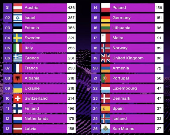 Nonostante le contestazioni, Israele ha ottenuto il punteggio più alto dal televoto europeo: ben 297 punti, superando nettamente l’Austria — vincitrice ufficiale della kermesse — ferma a 107 punti dal pubblico.