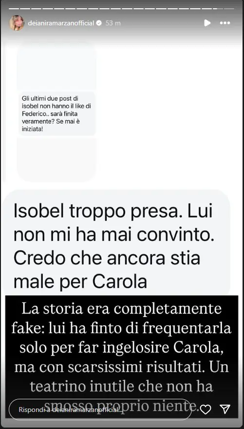 Ecco la segnalazione di Deianira Marzano: “Gli ultimi due post di Isobel non hanno il like di Federico. Inoltre, lei troppo presa. Lui non mi ha mai convinto. Credo che ancora stia male per Carola. La storia era completamente fake: lui ha finto di frequentarla solo per far ingelosire Carola, ma con scarsissimi risultati. Un teatrino inutile che non ha smosso proprio niente”, ha dichiarato sul suo profilo Instagram ufficiale l’esperta di gossip campana d’origine.