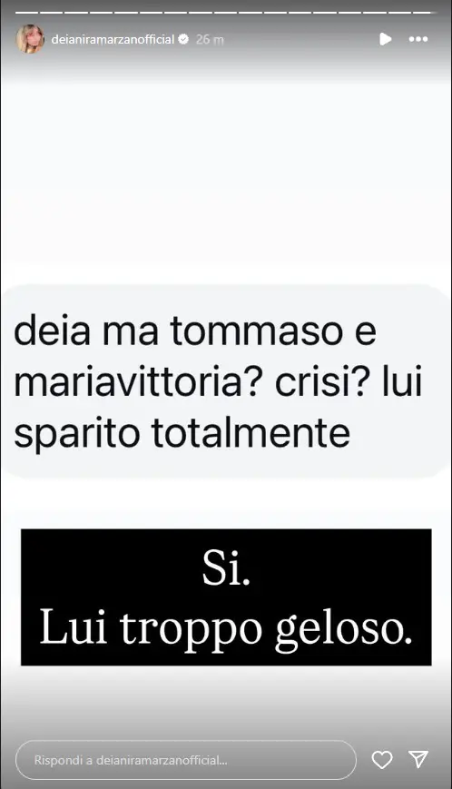 Ecco la segnalazione riportata da Deianira Marzano: “Ma Tommaso e Maria Vittoria crisi? Lui sparito totalmente. Sì, lui troppo geloso”, ha replicato l’esperta di gossip e influencer originaria della Campania.