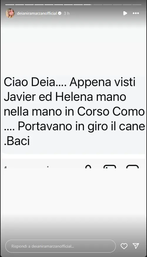 Ecco riportate, di seguito, le parole di un utente, come pubblicato dall’esperta di gossip, Deianira Marzano su Instagram: “Ciao Deia.. Appena visti Javier ed Helena mano nella mano in Corso Como.. portavano in giro il cane. Baci”.