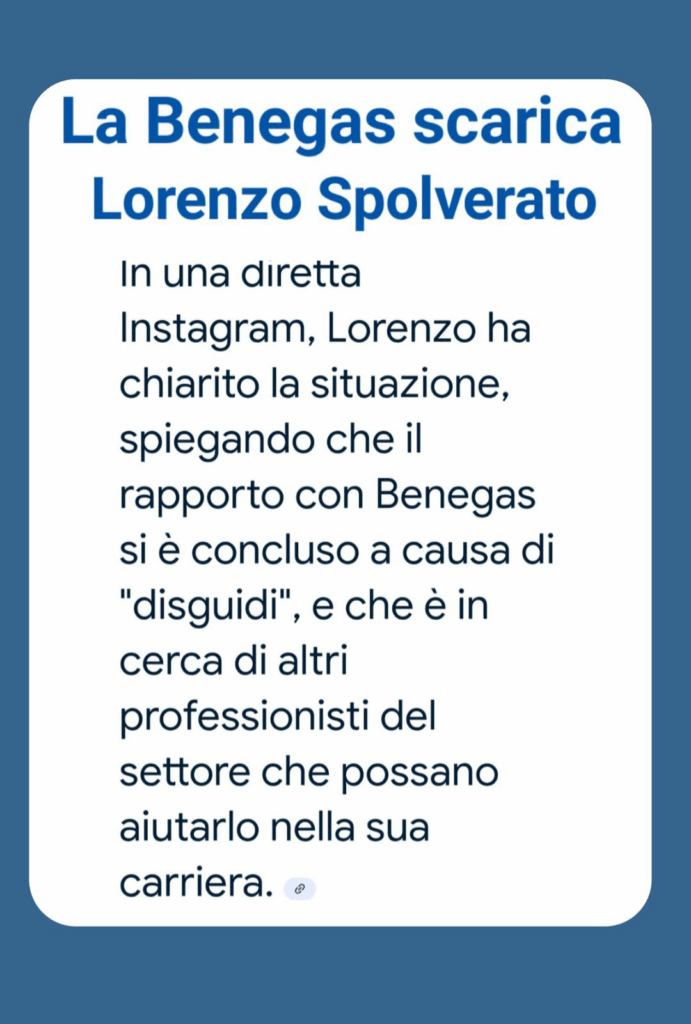 Il modello, in una diretta su Instagram ha ammesso di aver avuto dei disguidi con la Benegas, e che è in cerca di altre aziende che possano occuparsi di lui. Tra l’altro, proprio questa agenzia, segue gli interessi di Helena Prestes e recentemente anche Javier Martinez, fidanzato dell’influencer brasiliano, si è unito alla squadra. Insomma, Lorenzo Spolverato perde il GF e anche il lavoro, almeno per ora.