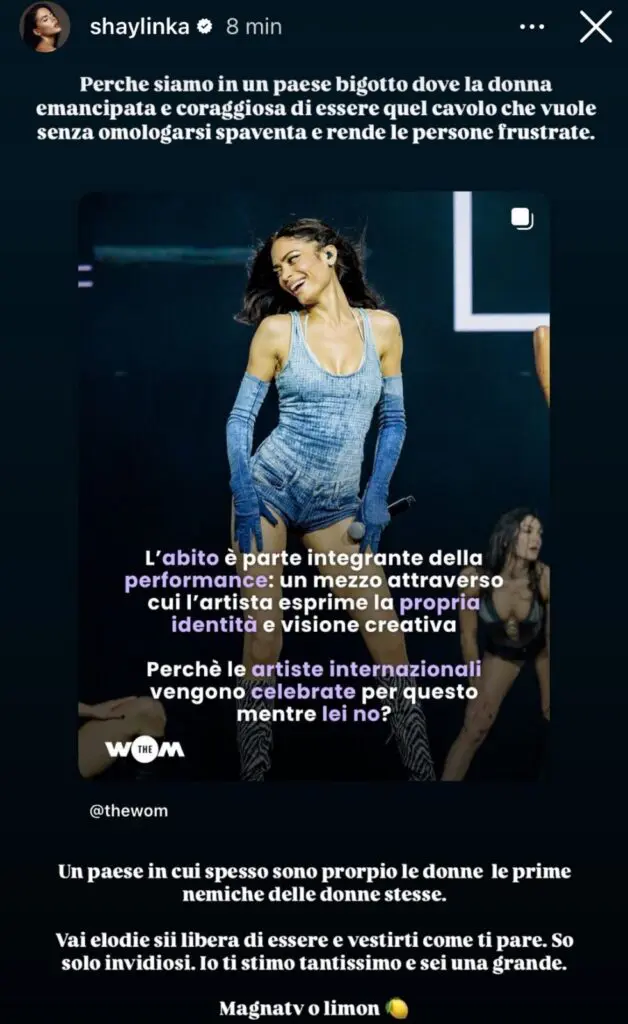 Ecco riportate, di seguito, le dichiarazioni di Shaila: “Perché siamo in un paese bigotto dove la donna emancipata e coraggiosa di essere quel cavolo che vuole senza omologarsi spaventa e rende le persone frustrate. Un paese in cui spesso sono proprio le donne le prime monache di sé stesse. Vai Elodie, sii libera di essere e vestirti come ti pare. Son solo invidiosi. Io ti stimo tantissimo e sei una grande”.