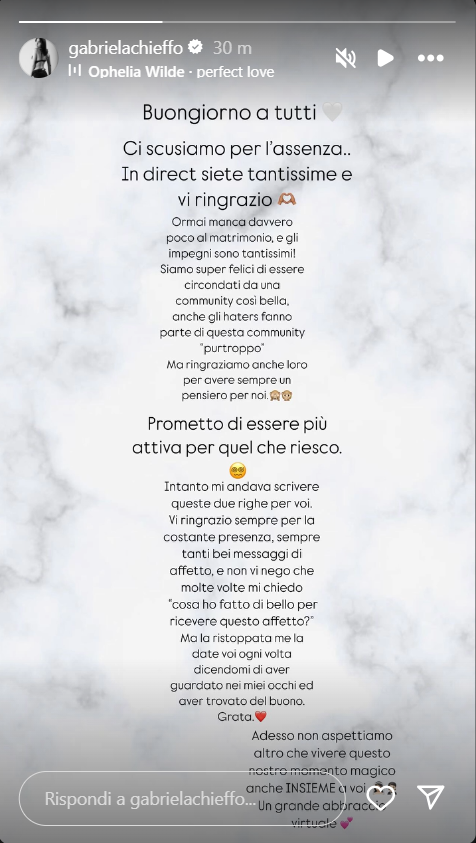 Ecco le parole della Chieffo: “Buongiorno a tutti, ci scusiamo per l’assenza.. In direct siete tantissime e vi ringrazio. Ormai manca davvero poco al matrimonio, e gli impegni sono tantissimi! Siamo super felici di essere circondati da una community così bella, anche gli haters fanno parte di questa community purtroppo. Ma ringraziamo anche loro per avere sempre un pensiero per noi. Prometto di essere più attiva per quel che riesco”.