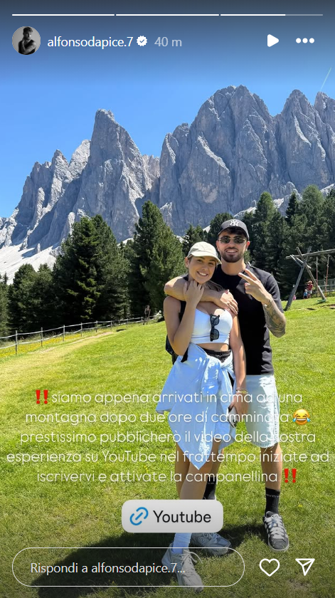 Ecco la Story pubblicata su Instagram da Alfonso: “Siamo appena arrivati in cima a una montagna dopo due ore di camminata. Prestissimo pubblicherò il video della nostra esperienza su YouTube. Nel frattempo iniziate a iscrivervi e attivate la campanella”.
