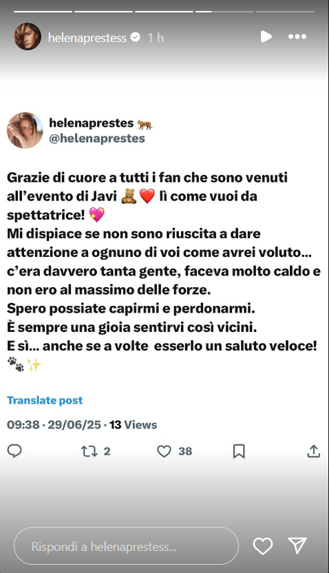 Ecco riportate, di seguito, le dichiarazioni della Prestes sui social: “Grazie di cuore a tutti i fan che sono venuti all’evento di Javi. Lì come voi da spettatrice. Mi dispiace se non sono riuscita a dare attenzione a ognuno di voi come avrei voluto.. c’era davvero tanta gente, faceva molto caldo e non ero al massimo delle forze. Spero possiate capirmi e perdonarmi.. è sempre una gioia sentirvi così vicini. E sì… anche se a volte è solo per un saluto veloce”.