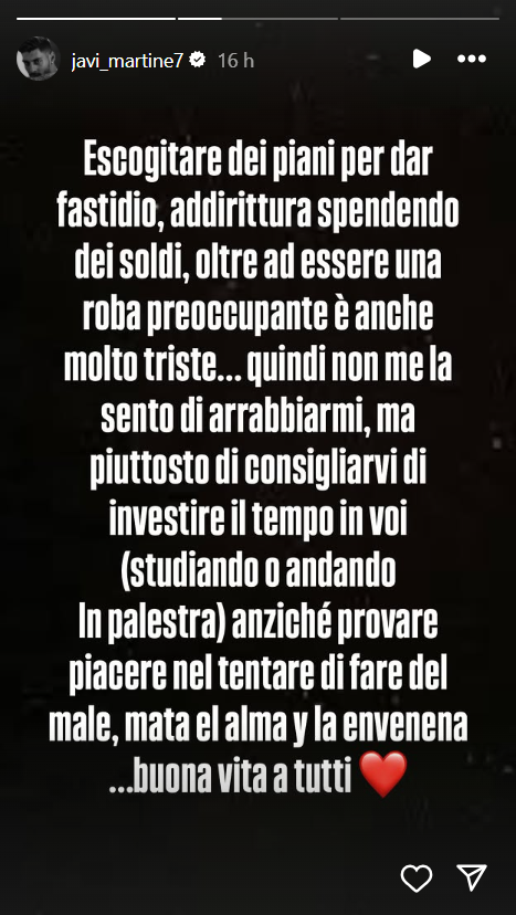 Ecco riportate, di seguito, le dichiarazioni di Martinez: “Escogitare dei piani per dar fastidio, addirittura spendendo dei soldi, oltre ad essere una roba preoccupante, è anche molto triste… quindi non me la sento di arrabbiarmi, ma piuttosto di consigliarvi di investire il tempo in voi (studiando o andando in palestra) anziché provare piacere nel tentare di fare del male”.