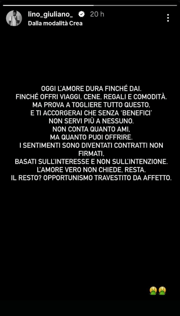 Ecco le dichiarazioni di Lino: “Oggi l’amore dura finché dai, finché offri viaggi, cene, regali e comodità. Ma prova a togliere tutto questo e ti accorgerai che senza benefici non servi più a nessuno. Non conta quanto ami, ma quanto puoi offrire. I sentimenti sono diventati contratti non firmati, basati sull’interesse e non sull’intenzione. L’amore vero non chiede, resta. Il resto? Opportunismo travestito da affetto”, ha scritto Giuliano sul suo profilo Instagram ufficiale.