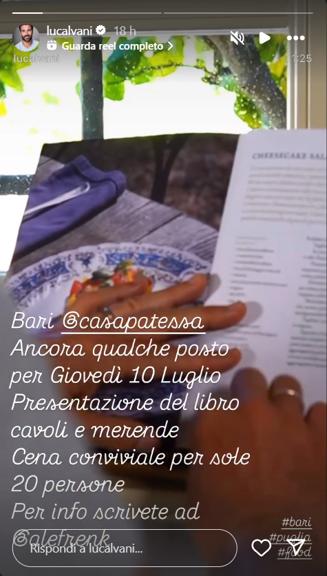 Ecco riportate, di seguito, le dichiarazioni di Luca Calvani: “Bari, ancora qualche posto per giovedì 10 luglio. Presentazione del libro ‘Cavoli e merende’. Cena conviviale per sole 20 persone. Per info scrivete ad Ale Frenk”.