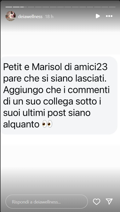 Ecco quanto riportato dalla Marzano: “Petit e Marisol di Amici 23 pare che si siano lasciati. Aggiungo che i commenti di un suo collega sotto i suoi ultimi post siano alquanto sospetti”.