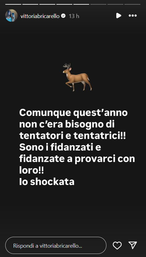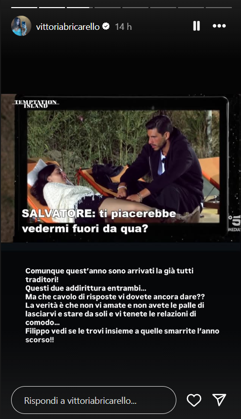 Su Sarah Esposito ha invece detto: ‘Comunque quest’anno sono arrivati là già tutti traditori! Questi due addirittura entrambi… Ma che cavolo di risposte vi dovete ancora dare?? La verità è che non vi amate e non avete le palle di lasciarvi e stare da soli e vi tenete le relazioni di comodo.. Filippo vedi se le trovi insieme a quelle smarrite l’anno scorso!”, ha scritto sui social Vittoria.