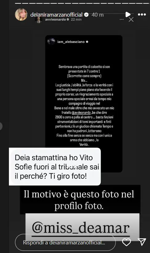 Ecco quanto riportato da Deianira Marzano sul suo profilo Instagram ufficiale in merito al comunicato diramato da Alessandro: “Sembrava una partita di calcetto, si son presentate in 7 contro 1 (scorrette come sempre). Ma.. La giustizia, l’abilità, la forza e la verità con i suoi lunghi tempi piano piano sta facendo il proprio corso, un ringraziamento speciale a una persona speciale ormai da tempo mio compagno di viaggio nel bene e nel male, oltre che mio avvocato un mio fratello. Beh, che dire, 2800 a zero e palla al centro.. basta finzioni, strumentalizzazioni di temi importanti e finti perbenismi, c’è un giudice chiamato Tempo e non ha padroni, lotteremo. Fino alla fine, senza se senza ma, con l’unica arma che abbiamo, la verità. Deia, stamattina ho visto Sophie fuori al Tribunale: sai perché? Ti giro la foto: oscura il nome”.