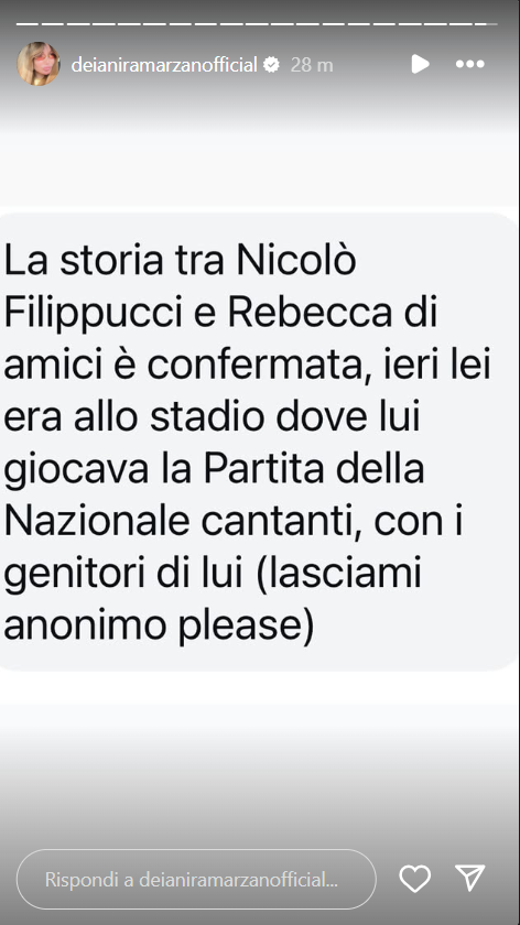 Ecco quanto riportato da Deianira Marzano sui suoi canali social ufficiali: “La storia tra Nicolò Filippucci e Rebecca Ferreri è confermata. Ieri lei era allo stadio dove lui giocava la Partita del cuore con la Nazionale Cantanti, con i genitori di lui (lasciami anonimo please).
