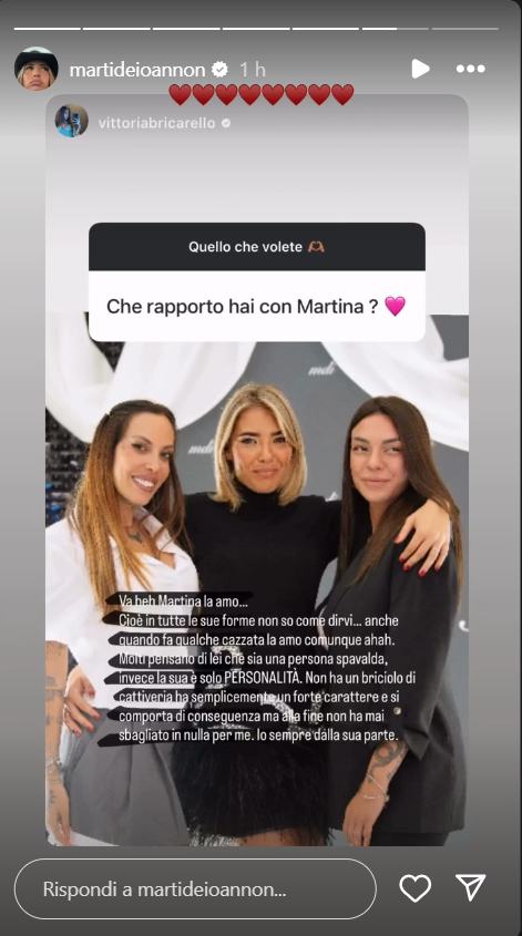 Ecco riportate, di seguito, le dichiarazioni della Bricarello: “Va beh.. Martina la amo.. cioè in tutte le sue forme non so come dirvi.. anche quando fa qualche c***a*a la amo comunque. Molti pensano di lei che sia una persona spavalda, ma la sua è solo personalità. Non ha un briciolo di cattiveria, ha semplicemente un forte carattere e si comporta di conseguenza. Ma alla fine non ha mai sbagliato in nulla per me, io sempre dalla sua parte”.