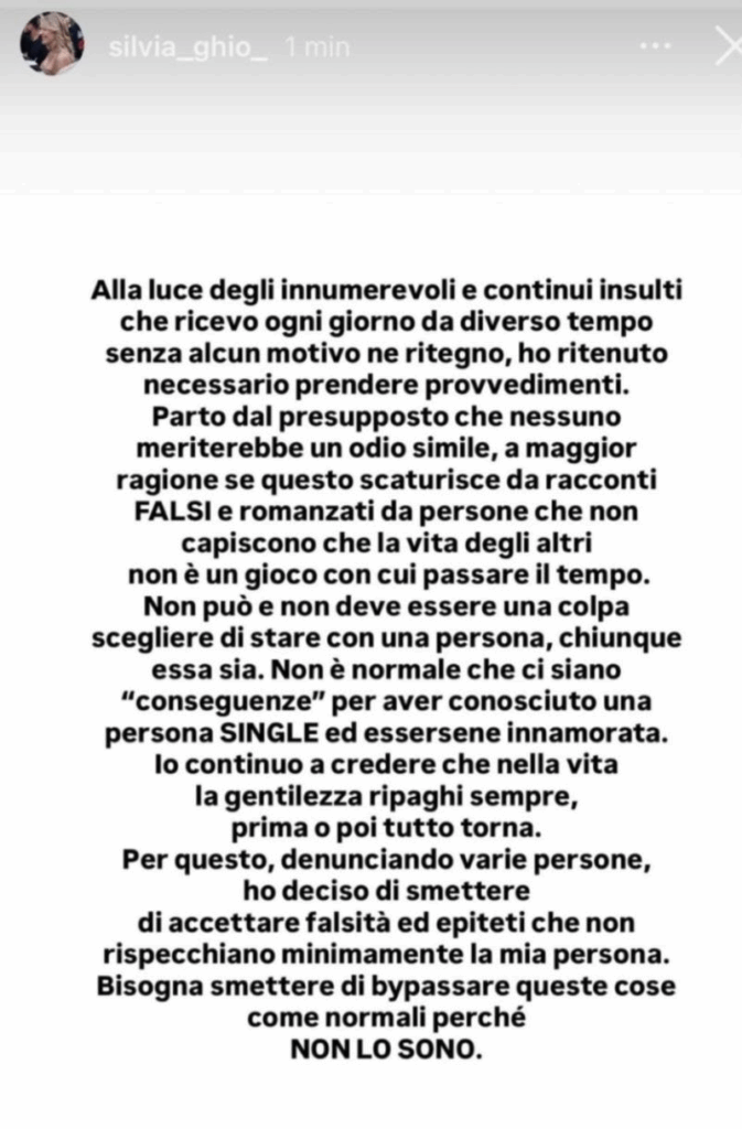 Ecco riportate, di seguito, le dichiarazioni di Silvia: ‘Alla luce degli innumerevoli e continui insulti che ricevo ogni giorno da diverso tempo senza alcun motivo ne ritegno, ho ritenuto necessario prendere provvedimenti. Parto dal presupposto che nessuno meriterebbe un odio simile, a maggior ragione se questo scaturisce da racconti FALSI e romanzati da persone che non capiscono che la vita degli altri non è un gioco con cui passare il tempo‘.