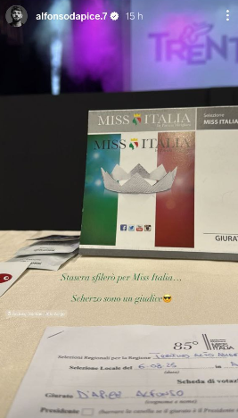 Dalla scheda visibile nella storia, si evince che la selezione riguardava proprio il territorio Trentino-Alto Adige, terra della fidanzata Chiara Cainelli. E a giudicare dal tono del post, Alfonso sembra essersi calato perfettamente nel ruolo di giurato, con il suo immancabile sorriso e stile inconfondibile. Il pubblico, che ha visto l’evento l’ultima volta nel 2019 in tv, potrà assistere il 15 settembre alla finalissima su San Marino Rtv e RayPlay in diretta alle 20:00.