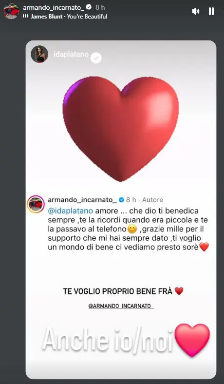 Nelle scorse ore, Armando Incarnato ha condiviso su Instagram una storia di Ida Platano, accompagnata da un grande cuore rosso. L’ex cavaliere ha scritto parole toccanti rivolte alla dama bresciana: “Amore… che Dio ti benedica sempre, te la ricordi quando era piccola e te la passavo al telefono, grazie mille per il supporto che mi hai sempre dato, ti voglio un mondo di bene, ci vediamo presto sorè”.