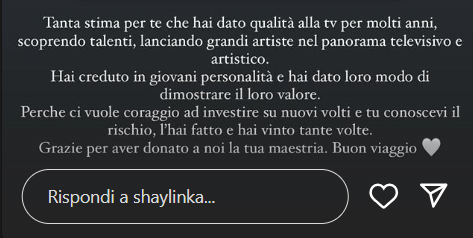 Di seguito, trovate le dichiarazioni di Shaila: “Tanta stima per te che hai dato qualità alla Tv per molti anni, scoprendo talenti, lanciando grandi artiste nel panorama televisivo e artistico. Hai creduto in giovani personalità e hai dato loro modo di dimostrare il loro valore. Perché ci vuole coraggio a investire su nuovi volti e tu conoscevi il rischio, l’hai fatto e hai vinto tante volte. Grazie per aver donato a noi la tua maestria. Buon viaggio”.