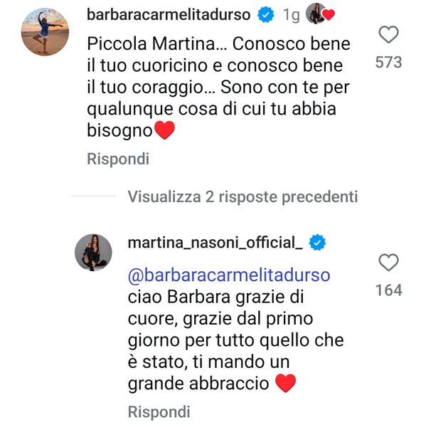 Ecco le sue dichiarazioni: “Piccola Martina… Conosco bene il tuo cuoricino e conosco bene il tuo coraggio… Sono con te per qualunque cosa di cui tu abbia bisogno”. La Nasoni, dal suo canto, ha replicato: “Ciao Barbara grazie di cuore, grazie dal primo giorno per tutto quello che è stato, ti mando un grande abbraccio”.
