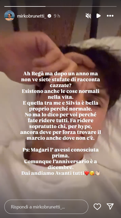Di seguito il comunicato: “Ah regà ma dopo un anno ma non ve siete stufate di racconta ca****e? Esistono anche le cose normali nella vita. E quella fra me e Silvia è bella proprio perché normale. No ma lo dico per voi perché fate ridere tutti. Fa ridere soprattutto chi, per hype, ancora deve per forza trovare il marcio anche dove non c’è. P.S.: Magari l’avessi conosciuta prima. Comunque l’anniversario è a dicembre. Dai andiamo avanti tutti”.