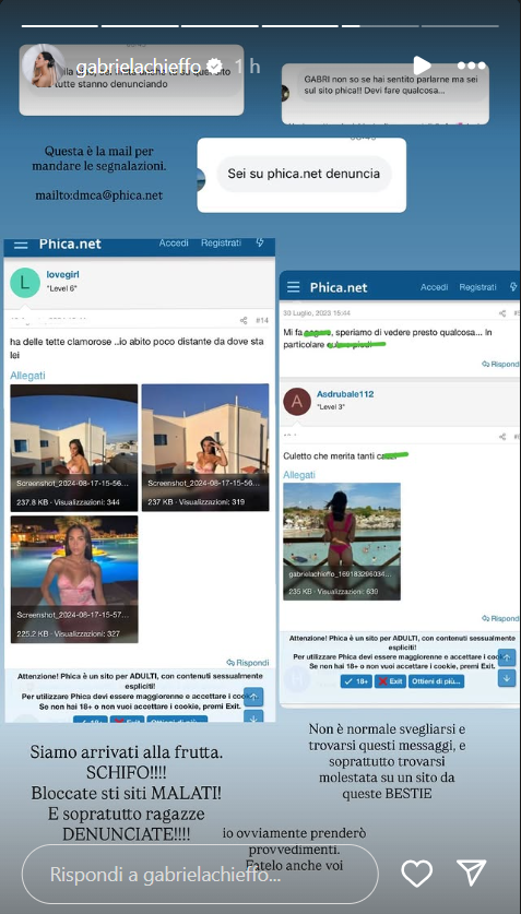 Gabriela Chieffo ha comunicato: “Questa è la mail per mandare le segnalazioni: siamo arrivati alla frutta! S****o! Bloccate sti siti malati! E soprattutto ragazze, denunciate! Non è normale svegliarsi e trovarsi questi messaggi, e soprattutto trovarsi molestata su un sito da queste bestie”.