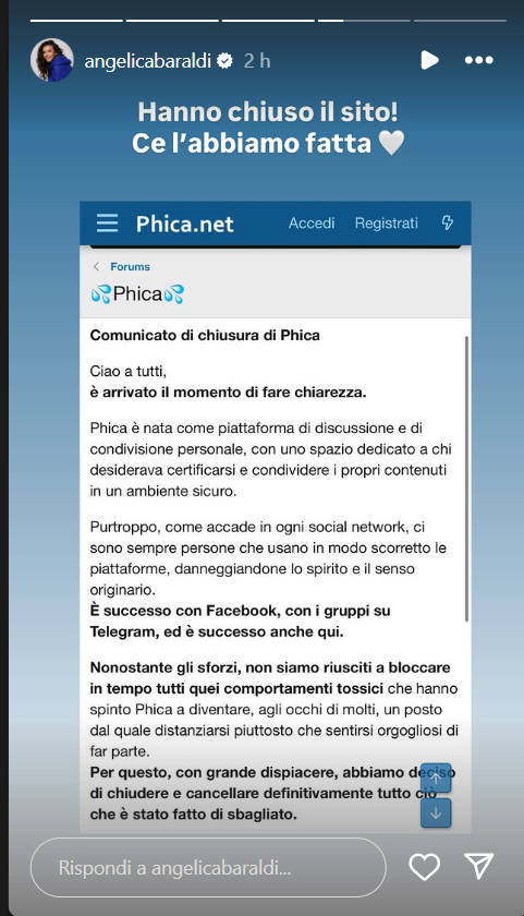 Angelica Baraldi ha dichiarato: “Hanno chiuso il sito! Ce l’abbiamo fatta“.