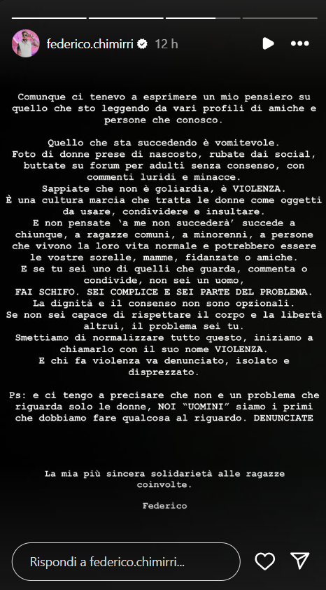 E ancora: “E non pensate ‘a me non succederà’, succede a chiunque, a ragazze comuni, a minorenni, a persone che vivono la loro vita normale e potrebbero essere le vostre sorelle, mamme, fidanzate o amiche. E se tu sei uno di quelli che guarda, commenta o condivide, non sei un uomo, fai sch**o. Sei complice e sei parte del problema. La dignità e il consenso non sono opzionali”, ha proseguito Federico.