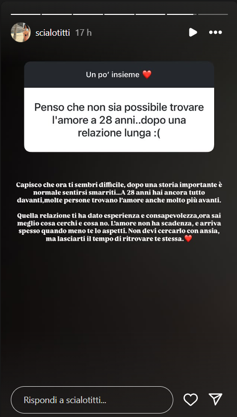 Titti ha dichiarato: “Capisco che ora ti sembri difficile, dopo una storia importante è normale sentirsi smarriti… A 28 anni hai ancora tutto davanti, molte persone trovano l’amore anche molto più avanti. Quella relazione ti ha dato esperienza e consapevolezza, ora sai meglio cosa cerchi e cosa no. L’amore non ha scadenza, e arriva spesso quando meno te lo aspetti. Non devi cercarlo con ansia, ma lasciarti il tempo di ritrovare te stessa”, ha scritto la Scialò sul suo profilo Instagram ufficiale.