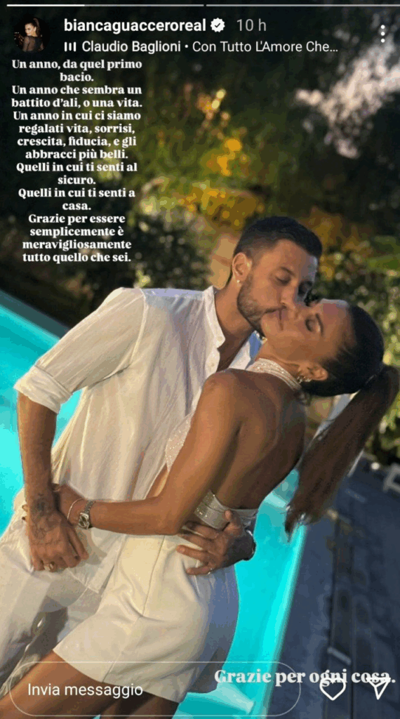 Nelle sue stories, la conduttrice ha scritto parole piene di sentimento, accompagnate da un tenero scatto a bordo piscina: “Un anno, da quel primo bacio. Un anno che sembra un battito d’ali, o una vita. Un anno in cui ci siamo regalati vita, sorrisi, crescita, fiducia, e gli abbracci più belli… Grazie per essere semplicemente e meravigliosamente tutto quello che sei.”