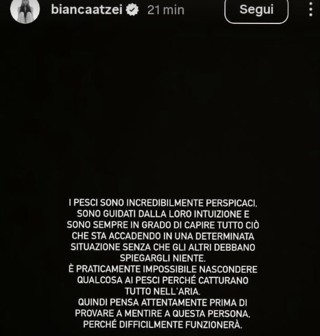 Ecco le dichiarazioni di Bianca: “I pesci sono incredibilmente perspicaci. Sono guidati dalla loro intuizione e sono sempre in grado di capire tutto ciò che sta accadendo in una determinata situazione senza che gli altri debbano spiegarli niente.. è praticamente impossibile nascondere qualcosa ai pesci perché catturano tutto nell’aria. Quindi pensa attentamente prima di provare a mentire a questa persona, perché difficilmente funzionerà”.