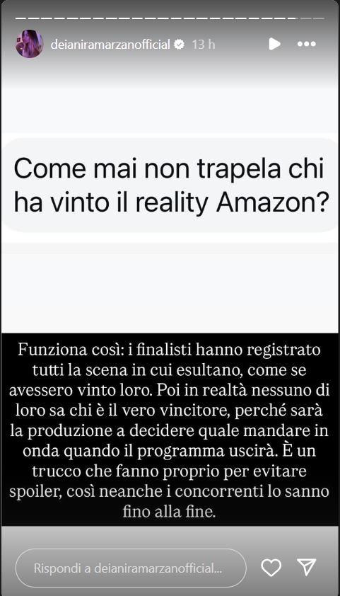 Ecco riportate, di seguito, le dichiarazioni dell’esperta di gossip originaria della Campania, sul suo profilo Instagram ufficiale: “Come mai non trapela chi ha vinto il reality Amazon? Funziona così: i finalisti hanno registrato tutti la scena in cui esultano, come se avessero vinto loro. Poi in realtà nessuno di loro sa chi è il vero vincitore, perché sarà la produzione a decidere quale mandare in onda quando il programma uscirà.. è un trucco che fanno proprio per evitare spoiler, così neanche i concorrenti lo sanno alla fine”.