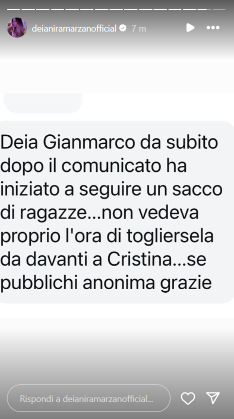 La Marzano, in queste ore, ha svelato: “Gianmarco da subito dopo il comunicato ha iniziato a seguire un sacco di ragazze… non vedeva l’ora di togliersela davanti a Cristina..”.
