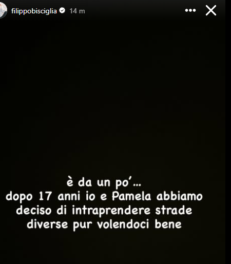 Un fulmine a ciel sereno per i fan di Filippo Bisciglia e Pamela Camassa: dopo 17 anni d’amore, la coppia ha deciso di prendere strade diverse. L’annuncio è arrivato direttamente tramite una Instagram Story pubblicata da Bisciglia, in cui il conduttore di Temptation Island ha scritto: “È da un po’… dopo 17 anni io e Pamela abbiamo deciso di intraprendere strade diverse pur volendoci bene”.