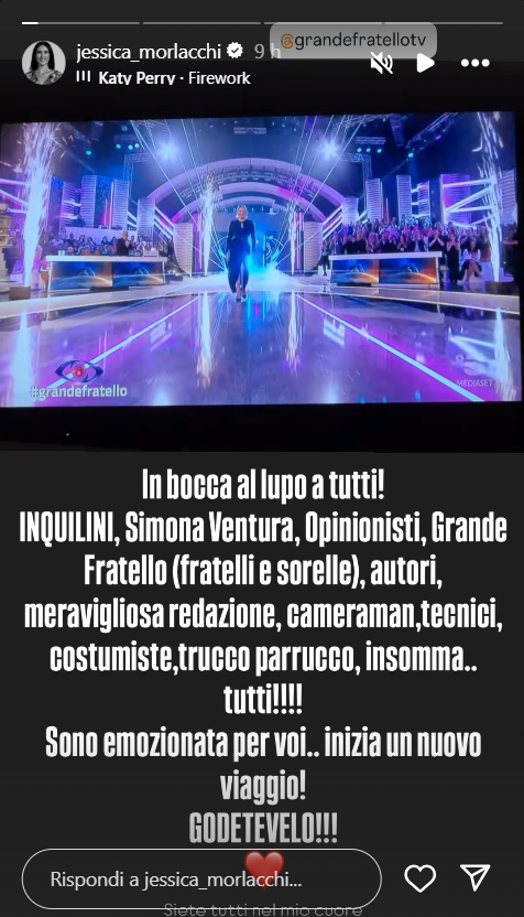 Ecco riportate, di seguito, le parole dell’ex amatissima protagonista del reality show di Canale 5: “In bocca al lupo a tutti! Inquilini, Simona Ventura, opinionisti, Grande Fratello (fratelli e sorelle), autori, meravigliosa redazione, cameraman, tecnici, costumiste, trucco, parrucco, insomma.. tutti! Sono emozionata per voi, inizia un nuovo viaggio. Godetevelo!”.