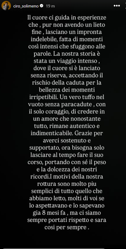 Ciro e Martina hanno poi spiegato che i motivi della rottura sono semplici, senza particolari colpi di scena, e che già da mesi qualcuno tra i fan intuiva che la relazione non stesse proseguendo nel migliore dei modi: “Molti di voi se lo aspettavano e lo sapevano già da 8 mesi fa – ha ammesso – ma ci siamo sempre portati rispetto e sarà così per sempre”. Parole che confermano una separazione serena, senza rancori né polemiche, ma con la volontà di mantenere il ricordo di quanto vissuto insieme.