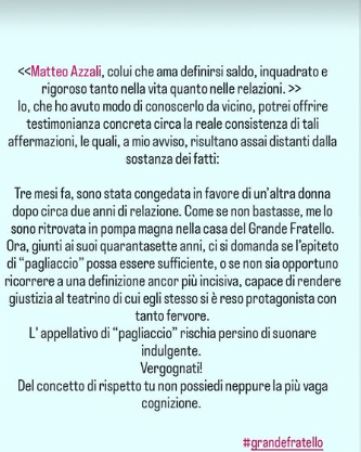 Ecco riportate, di seguito, le parole dell’ex di Matteo: “Matteo Azzali, colui che ama definirsi saldo, inquadrato e rigoroso tanto nella vita quanto nelle relazioni.. Io, che ho avuto modo di conoscerlo da vicino, potrei offrire testimonianza concreta circa la reale consistenza di tali affermazioni, le quali, a mio avviso, risultano assai distanti dalla sostanza dei fatti“.