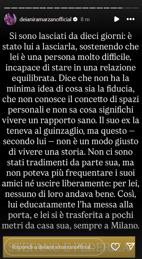 Ecco riportate, di seguito, le dichiarazioni della Marzano: “Si sono lasciati da dieci giorni: è stato lui a lasciarla, sostenendo che lei è una persona molto difficile, incapace di stare in una relazione equilibrata. Dice che non ha la minima idea di cosa sia la fiducia. Che non conosce il concetto di spazi personali e non sa cosa significhi vivere un rapporto sano. Il suo ex la teneva al guinzaglio, ma questo secondo lui, non è un modo giusto di vivere la storia”.